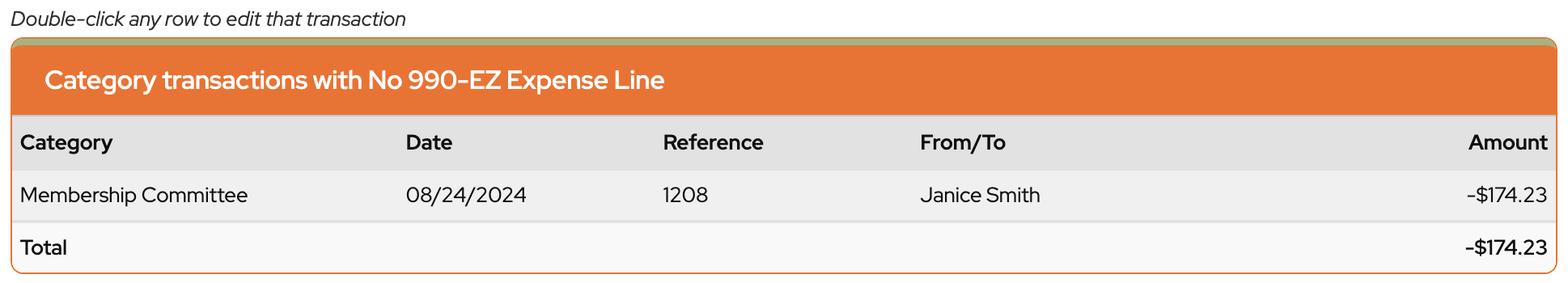 If a category has a transaction applied to it and does not have a 990EZ line number associated with it, it will show up at the top of the report in orange: