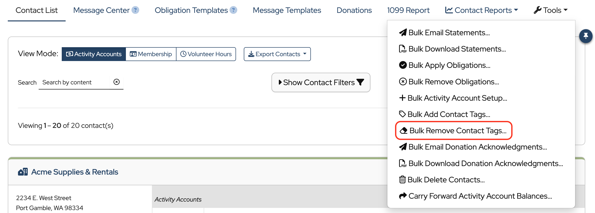 A useful tool when applying obligations or creating statements is the ability to “filter” your Contacts using Tags.