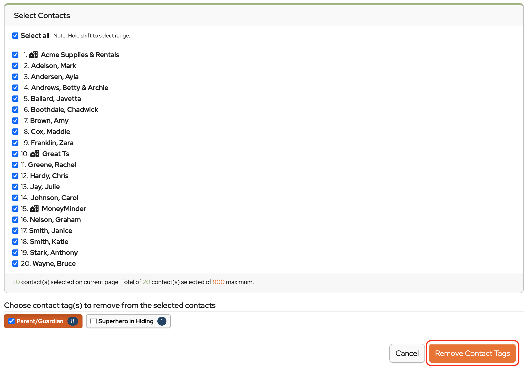 NOTE: Tags can be added to a maximum of 900 contacts at a time. Repeat the process to add tags to the remaining contacts.