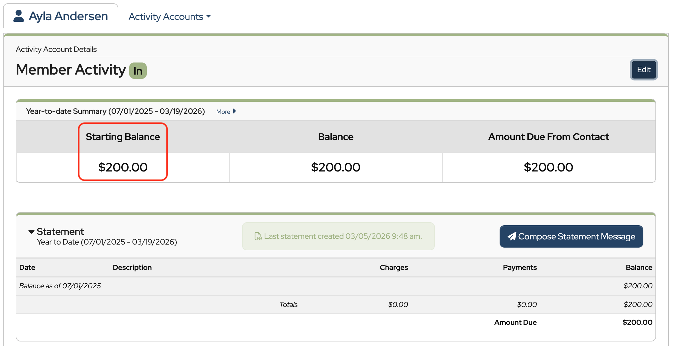 If contacts have existing balances at the time they’re set up in MoneyMinder, a starting balance can be entered in their Activity Account.