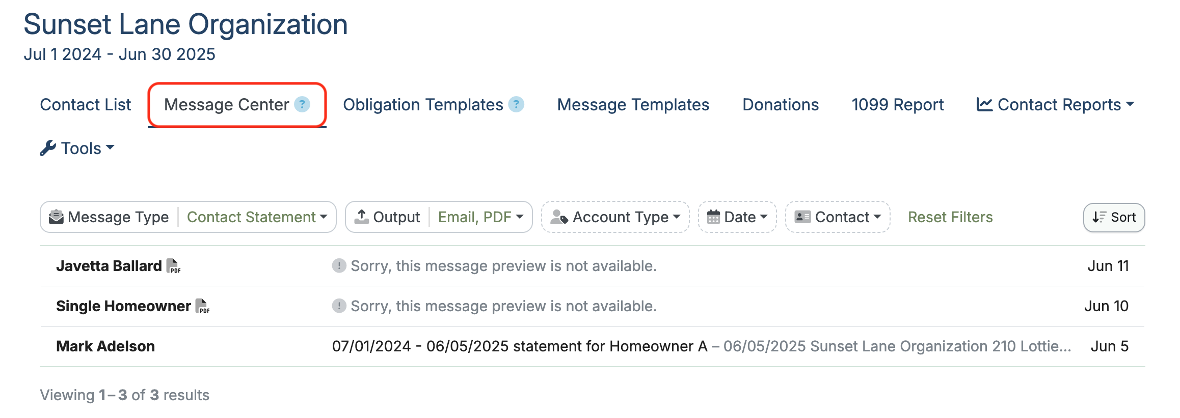 Contact Statements and Donation Acknowledgment Letters that have been emailed or downloaded are listed in the Message Center.