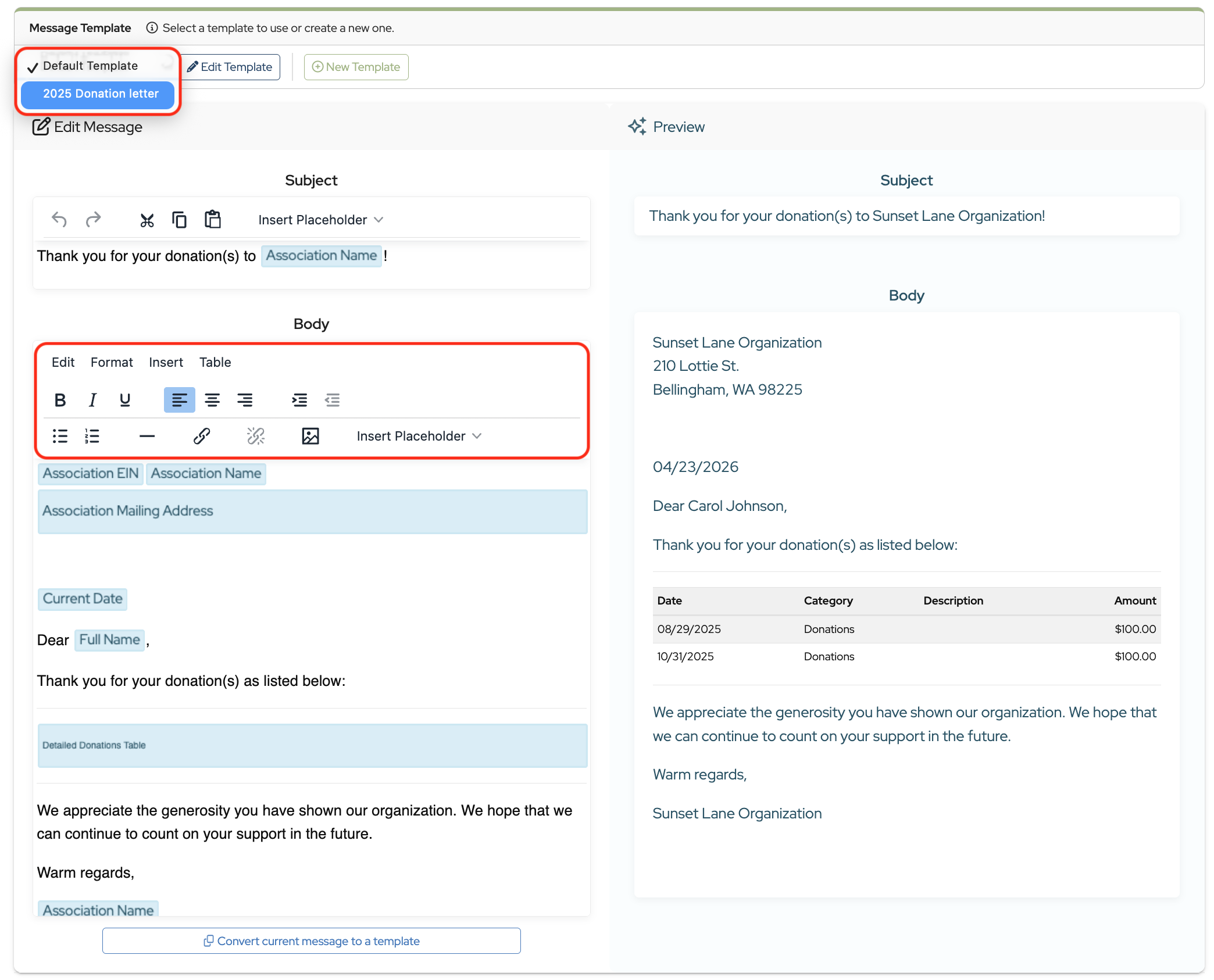 This works the same as the single-donor process. You can use the default template, customize a message, or select a saved template from the dropdown.