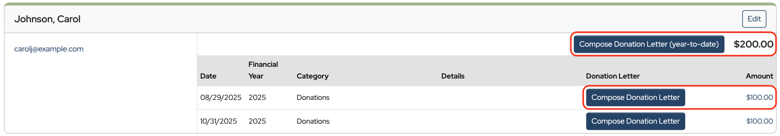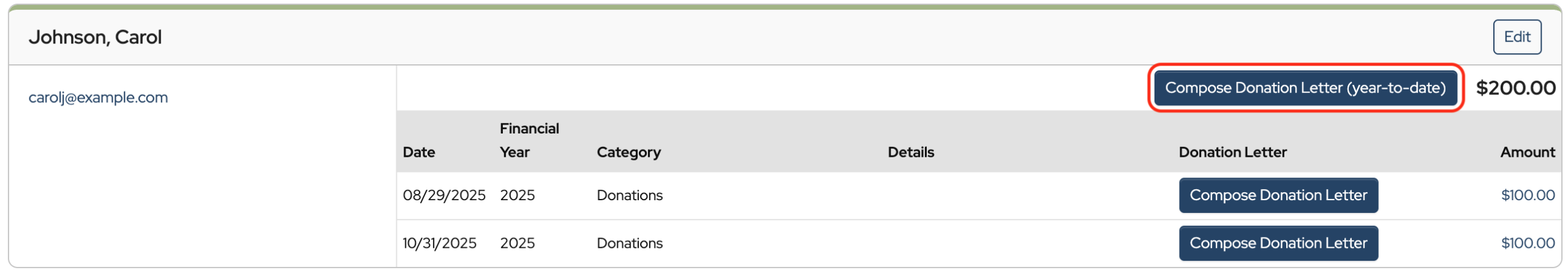 Click Compose Donation Letter (year-to-date).