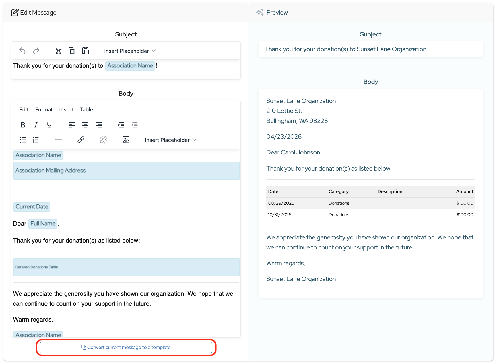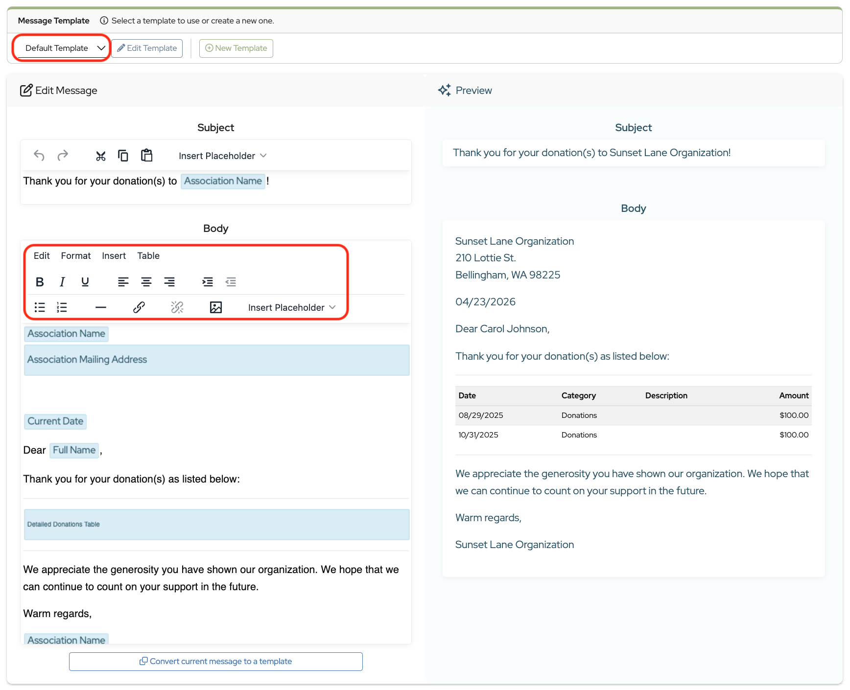To customize it, use Edit Message on the left to add text, links, images, or placeholders. You’ll see your updates appear in the Preview panel on the right.