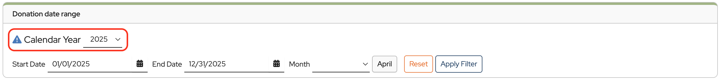 Donations are grouped by calendar year for tax purposes. You can choose any date range within that year.