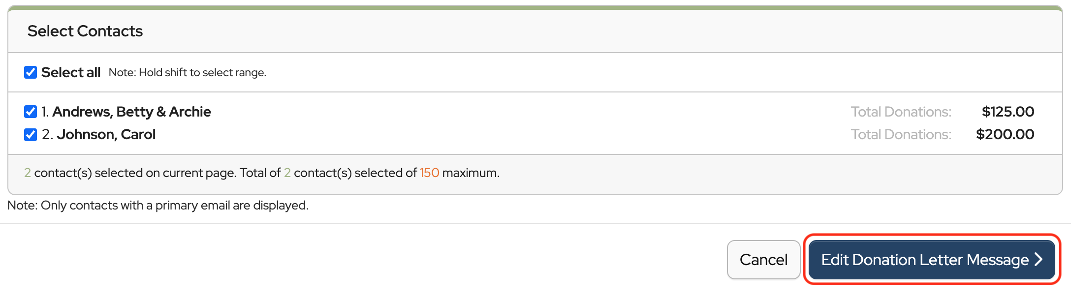 Note: For Bulk Email Donation Letters, only contacts with email addresses entered will appear in the list.