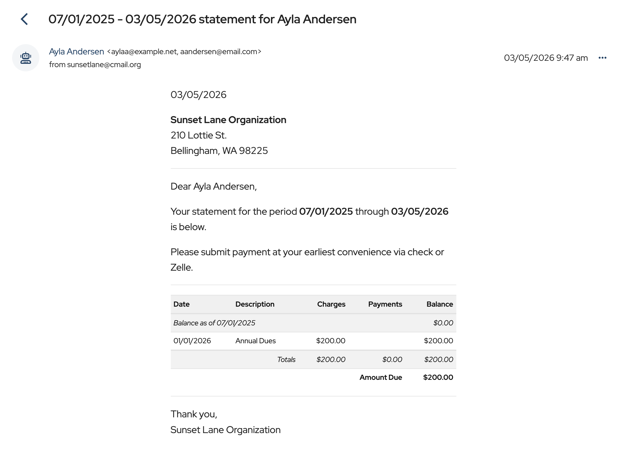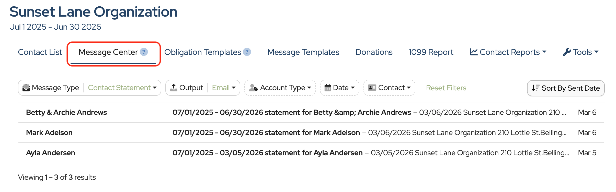 Contact Statements and Donation Acknowledgment Letters that have been emailed or downloaded are listed in the Message Center.