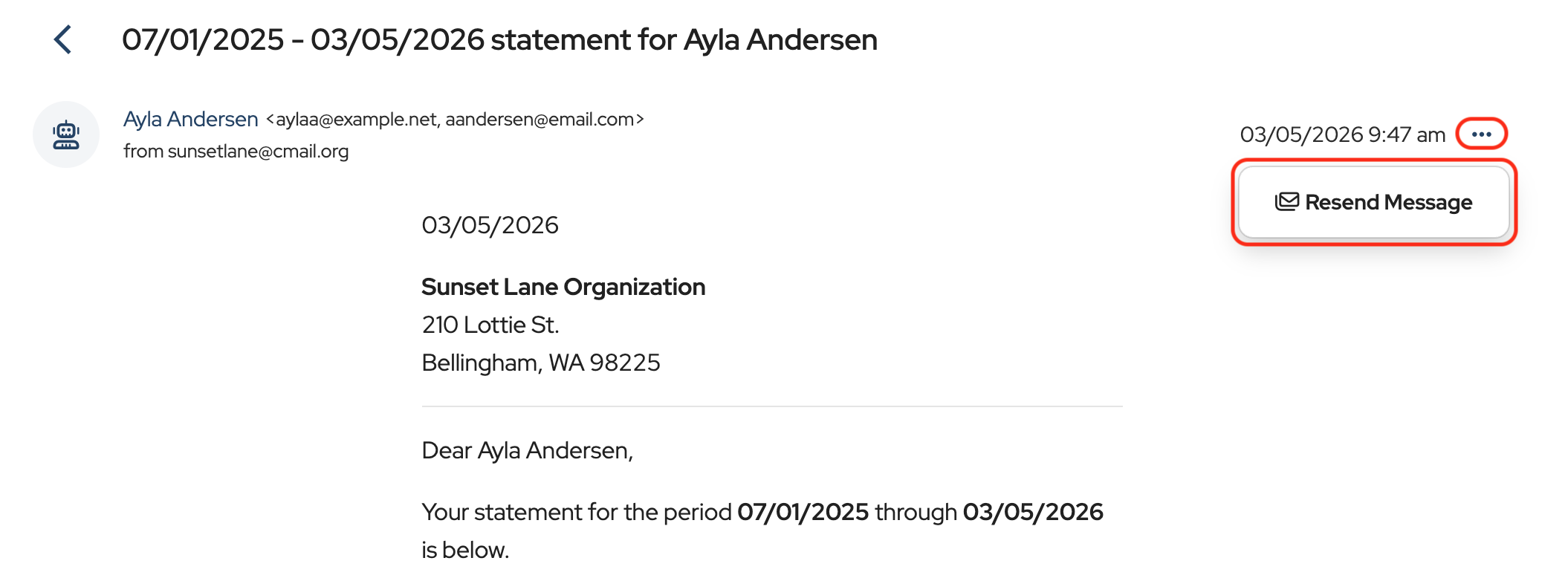 The message can be resent from this screen by clicking the three dots on the right and choosing Resend Message from the dropdown.