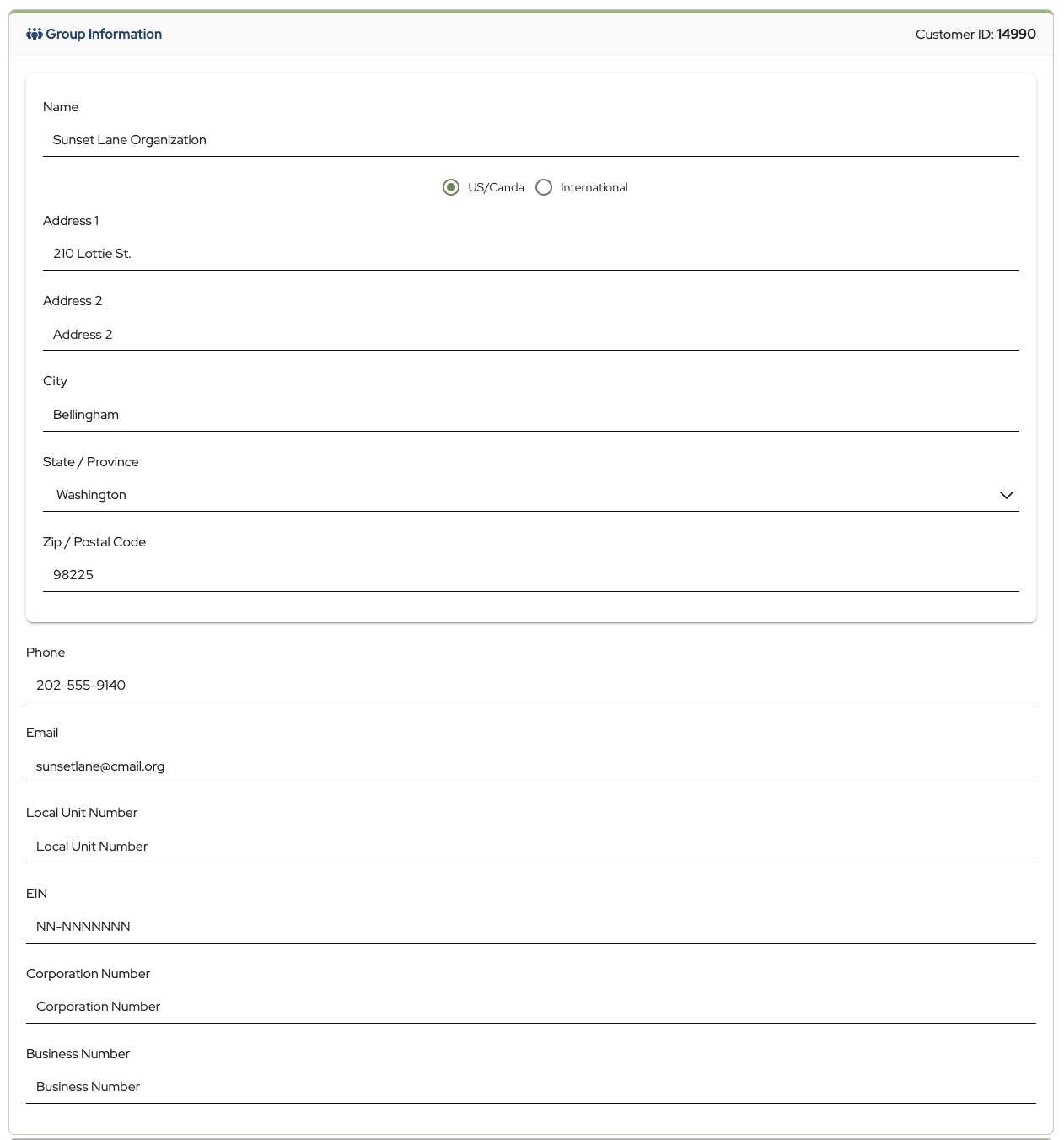 Group information such as name and address of the organization, phone number, email address, local unit number, EIN, corporation number, and business number can be entered or updated in the Group Information section.