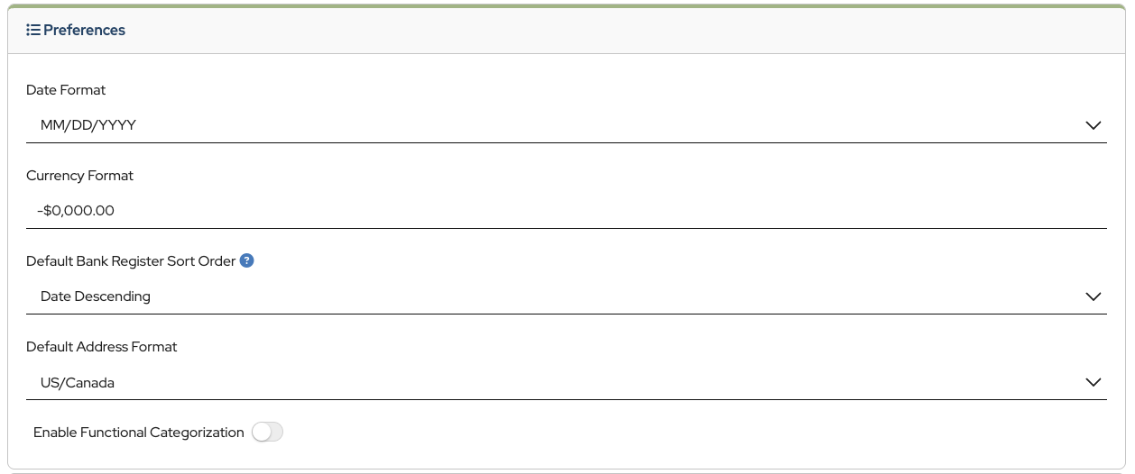 Date format, currency format, bank register sorting order (ascending or descending), and address format can be set in the Preferences section
