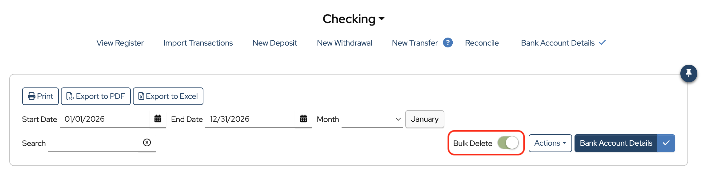 To bulk delete transactions, navigate to the bank register and toggle on Bulk Delete.