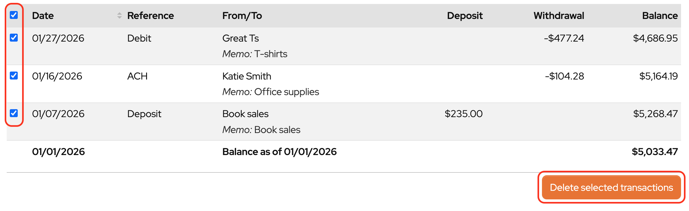 Select the transactions to be deleted. (Note: only transactions that are not reconciled can be deleted)