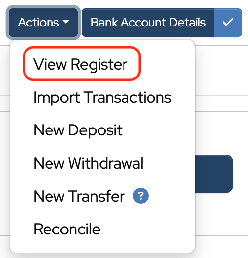 -Click the Actions dropdown to the right of the bank account and choose View Register.