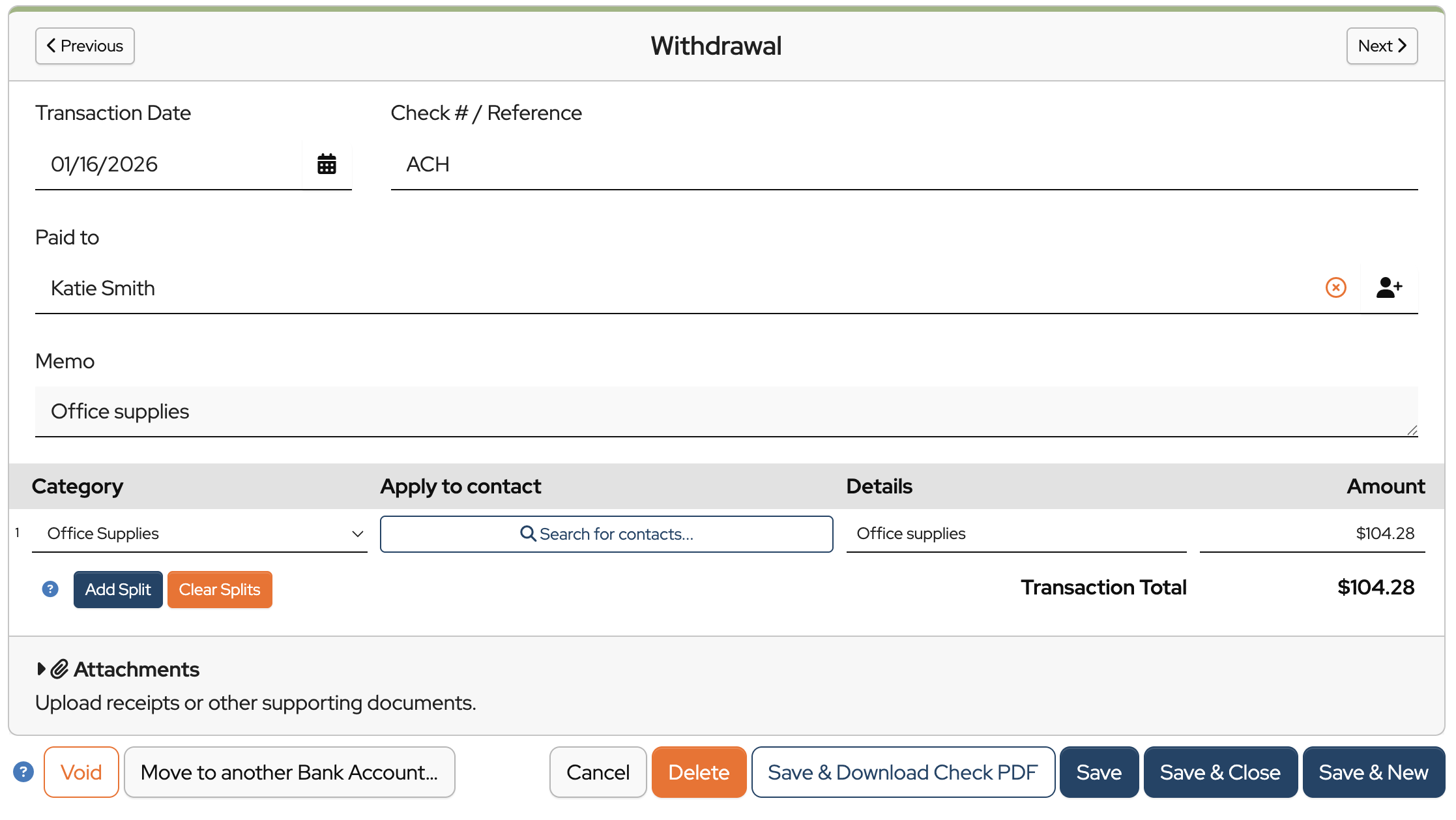 - Entering deposits & withdrawals; attaching receipts; viewing the bank register