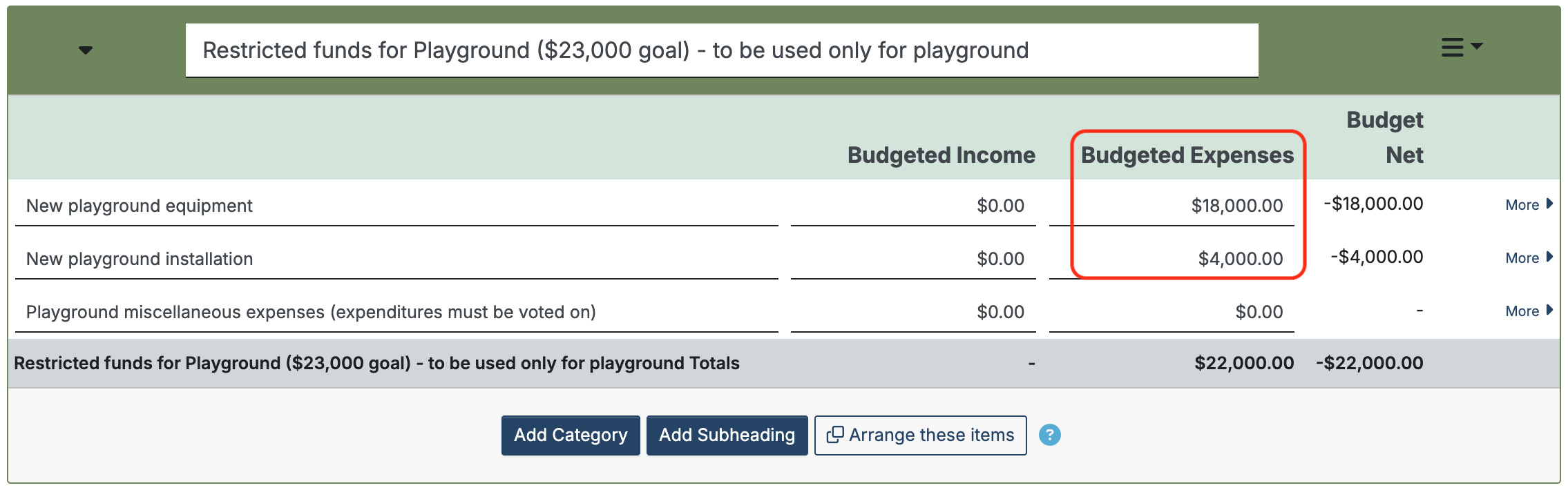 The More/-Less column is where you will see the running balance of the budget category. So in this case, there was $18,000 available to spend on New playground equipment, $17,471.29 was spent, so there is $528.71 left to spend