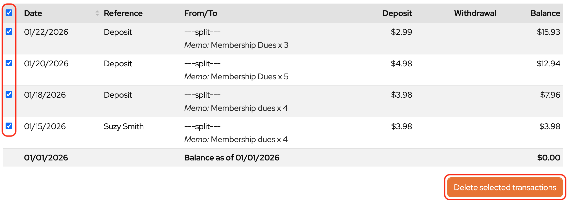 Select the transactions to be deleted. (Note: only transactions that are not reconciled can be deleted)