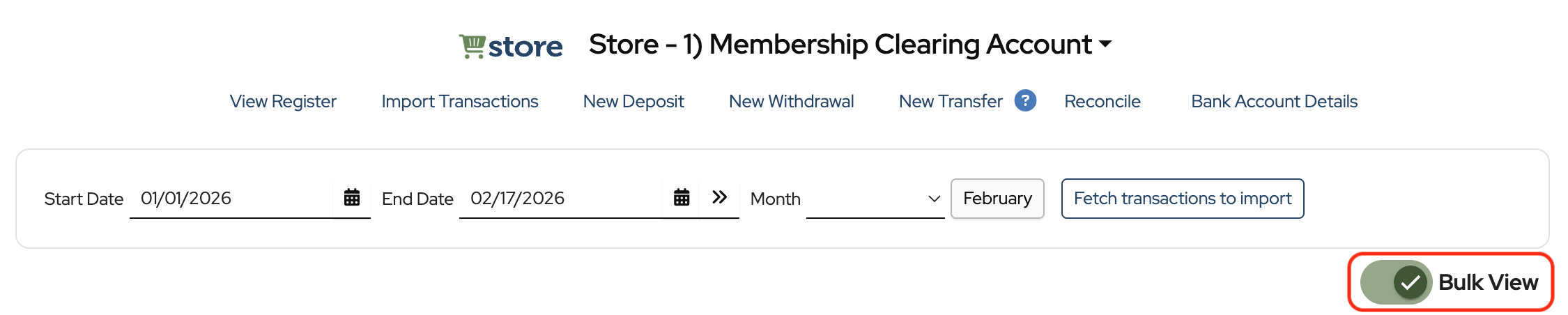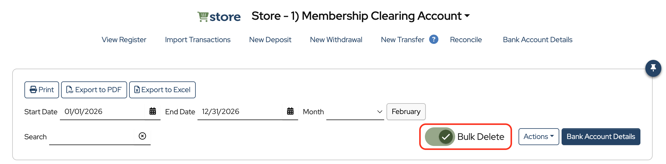 To bulk delete transactions, navigate to the bank register and toggle on Bulk Delete.