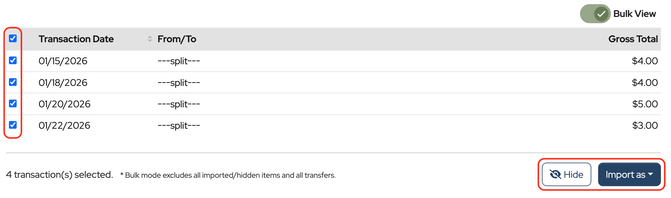 In the import screen after transactions have been fetched, toggle Bulk View on.