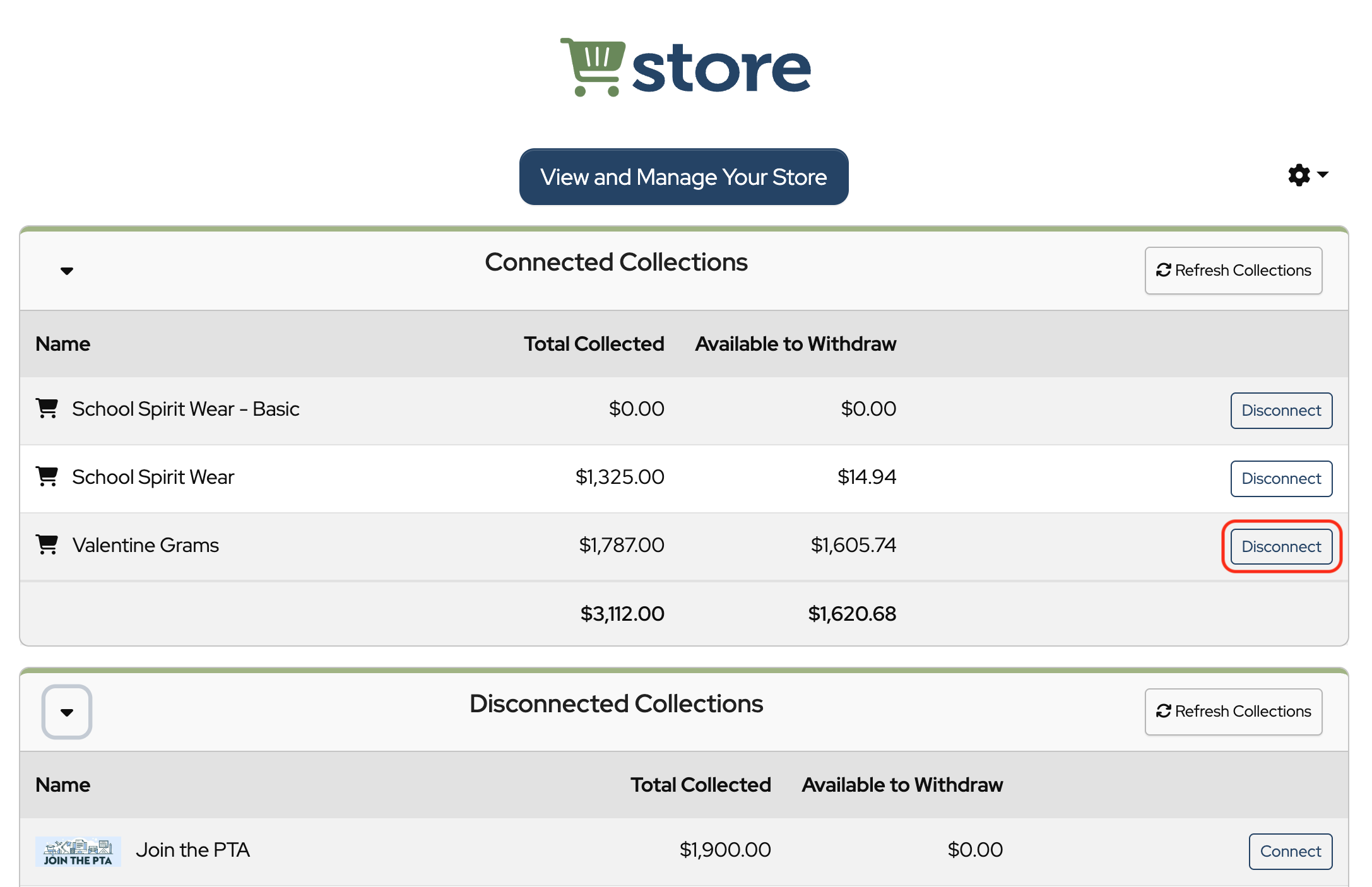 Click Disconnect to the right of the collection. This will move it into the Disconnected Collections section. It will also remove the Store clearing account from the banking page and remove the store fees category from the budget. Watch a quick video about this new feature.