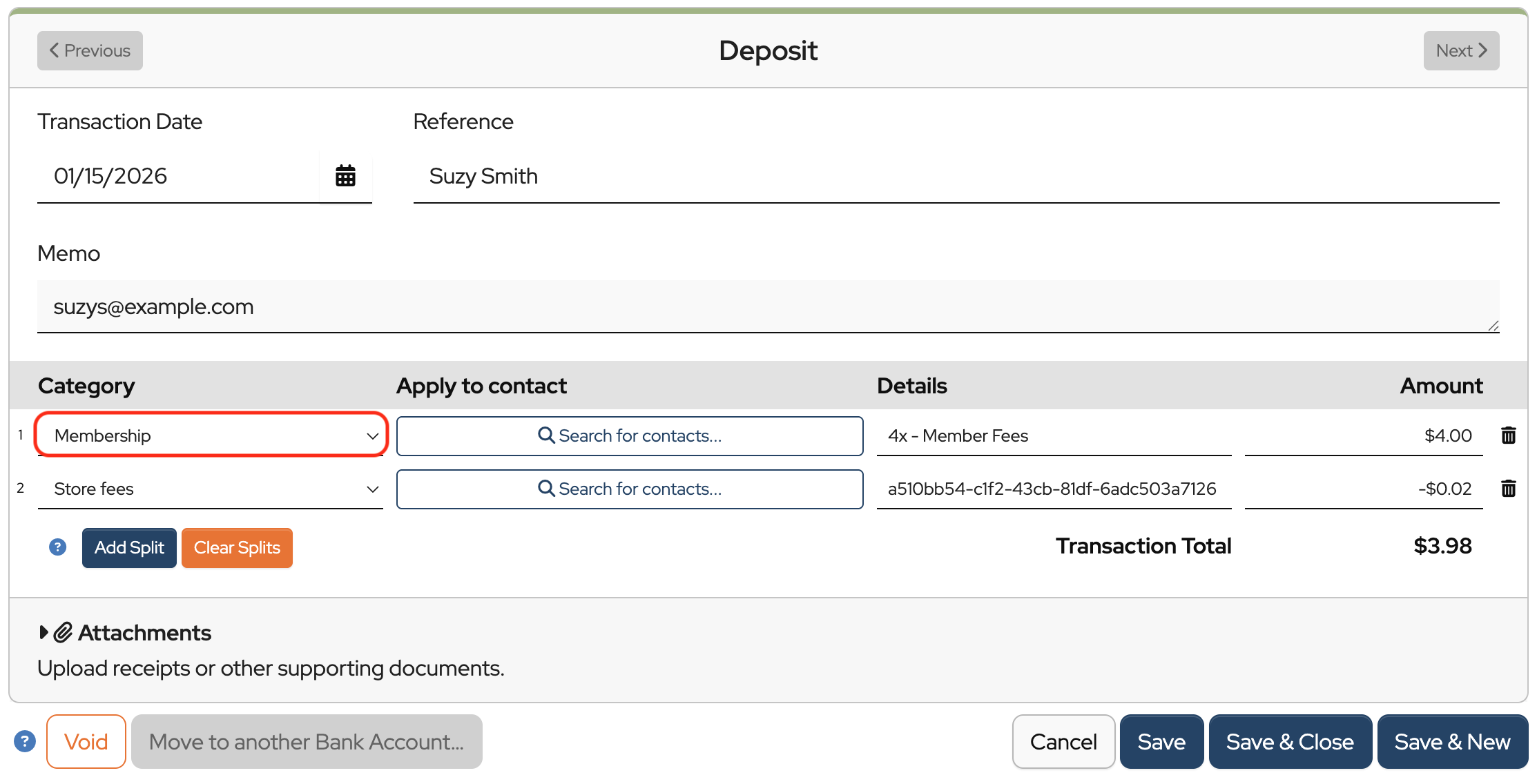 Check that all fields are filled correctly and assign a category. The store fees category will auto-populate as a split with a negative amount.