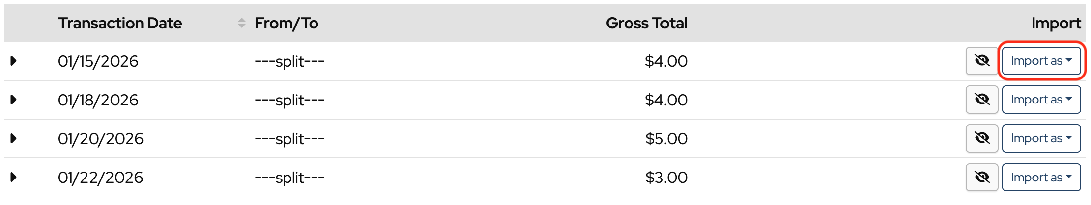 To hide a transaction so that it doesn’t get imported, click the “eye” icon.