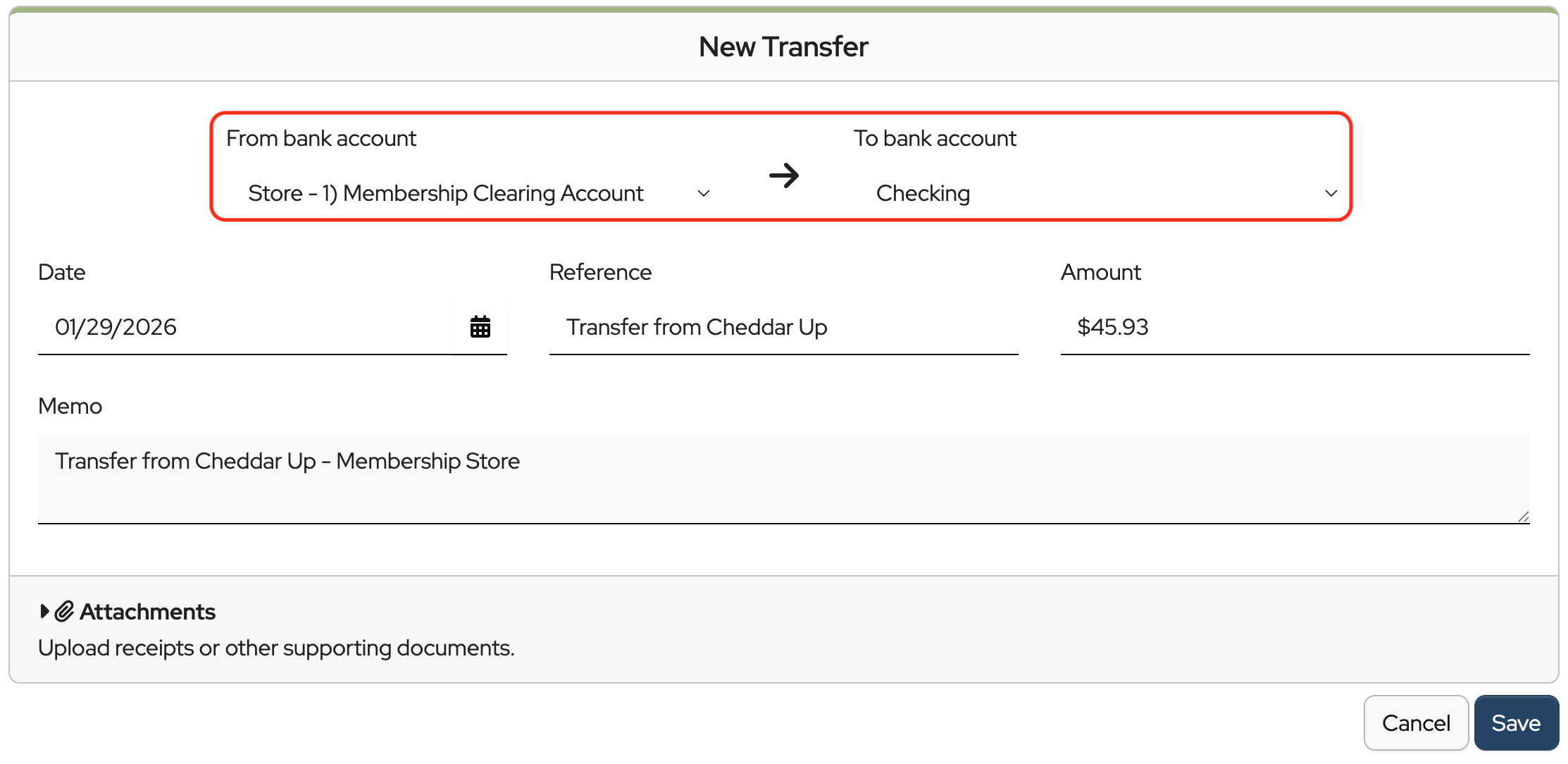 Note: If you have bank integration, deposits from Cheddar Up can be imported as transfers when importing into the bank account rather than being manually recorded.