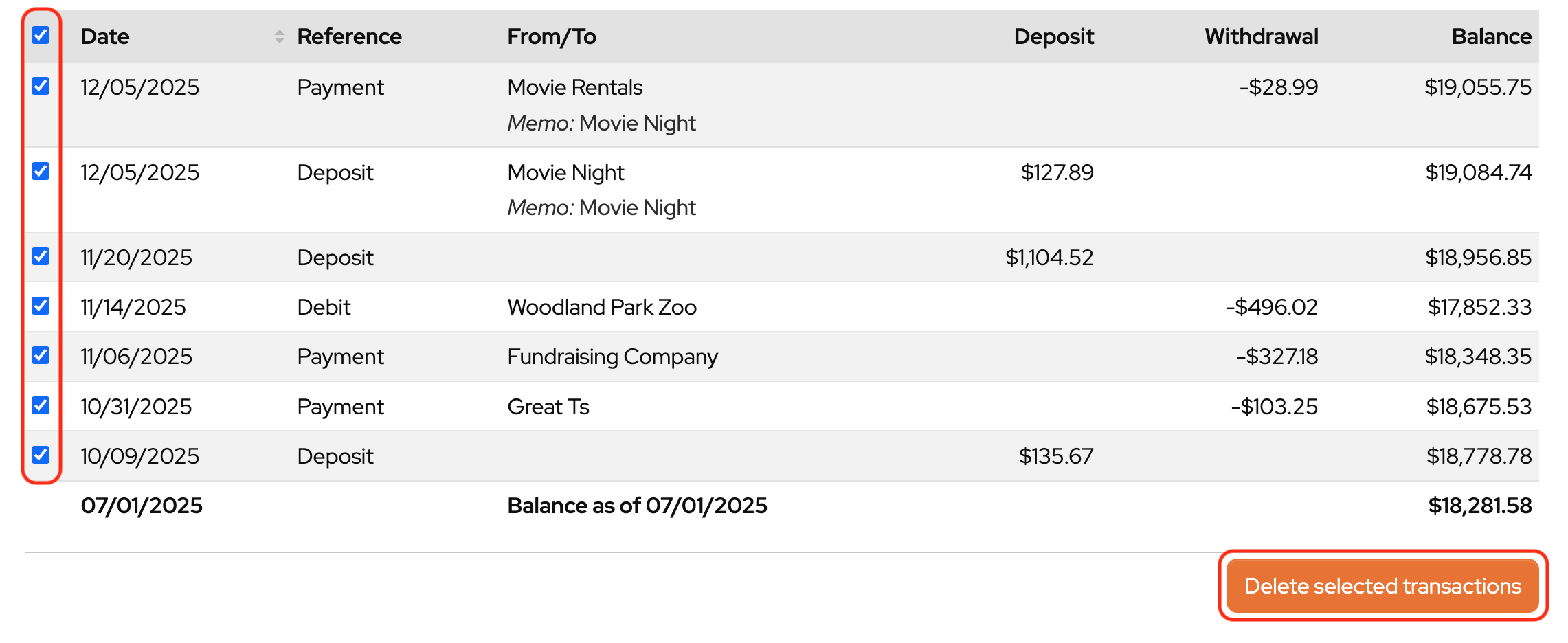 Select the transactions to be deleted. (Note: only transactions that are not reconciled can be deleted)