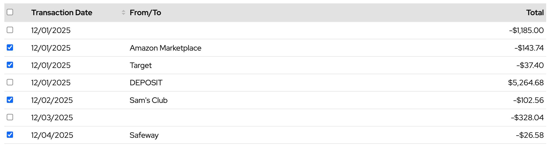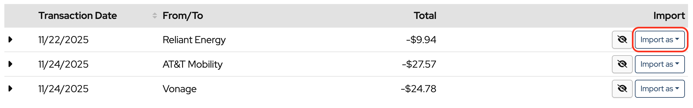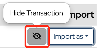 To hide a transaction so that it doesn’t get imported, click the “eye” icon.