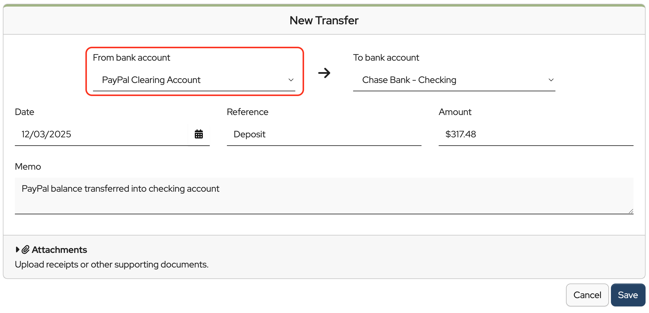 Check that the From bank account and the To bank account are selected correctly. If not, click the dropdown and select the correct bank account for each.