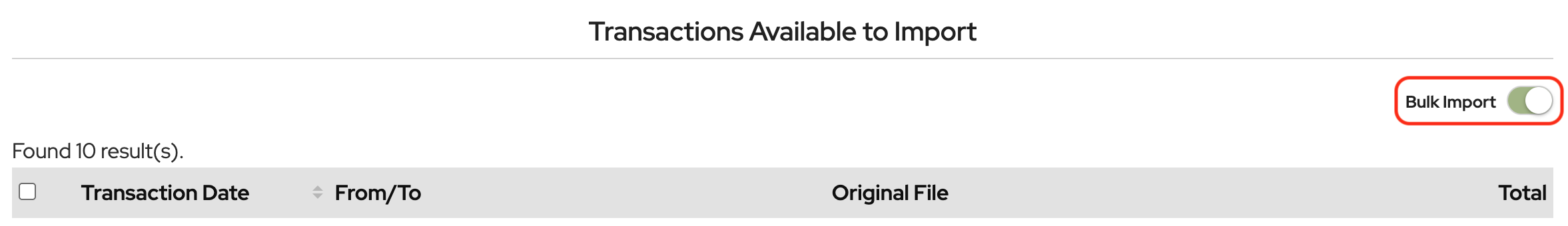 In the import screen after the transaction file has been uploaded, toggle Bulk Import on.