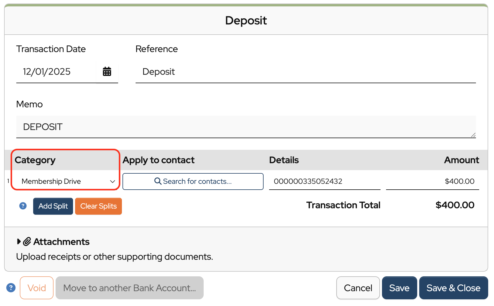 Check that all fields are filled correctly and assign a category from the dropdown. You can also attach a receipt at this point.