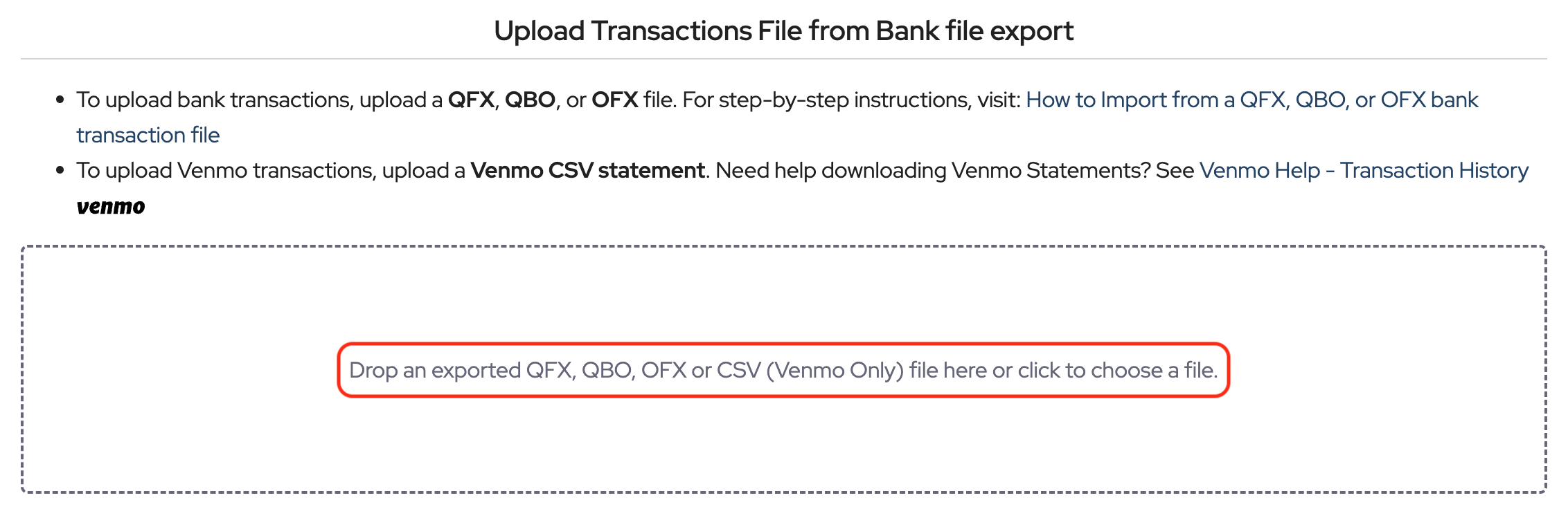 Drag & drop the export file from the bank or Venmo to the area that says, Drop an exported QFX, QBO, OFX or CSV (Venmo Only) file here or click to choose a file: