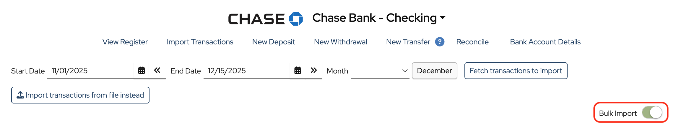 In the import screen after transactions have been fetched, toggle on Bulk Import.
