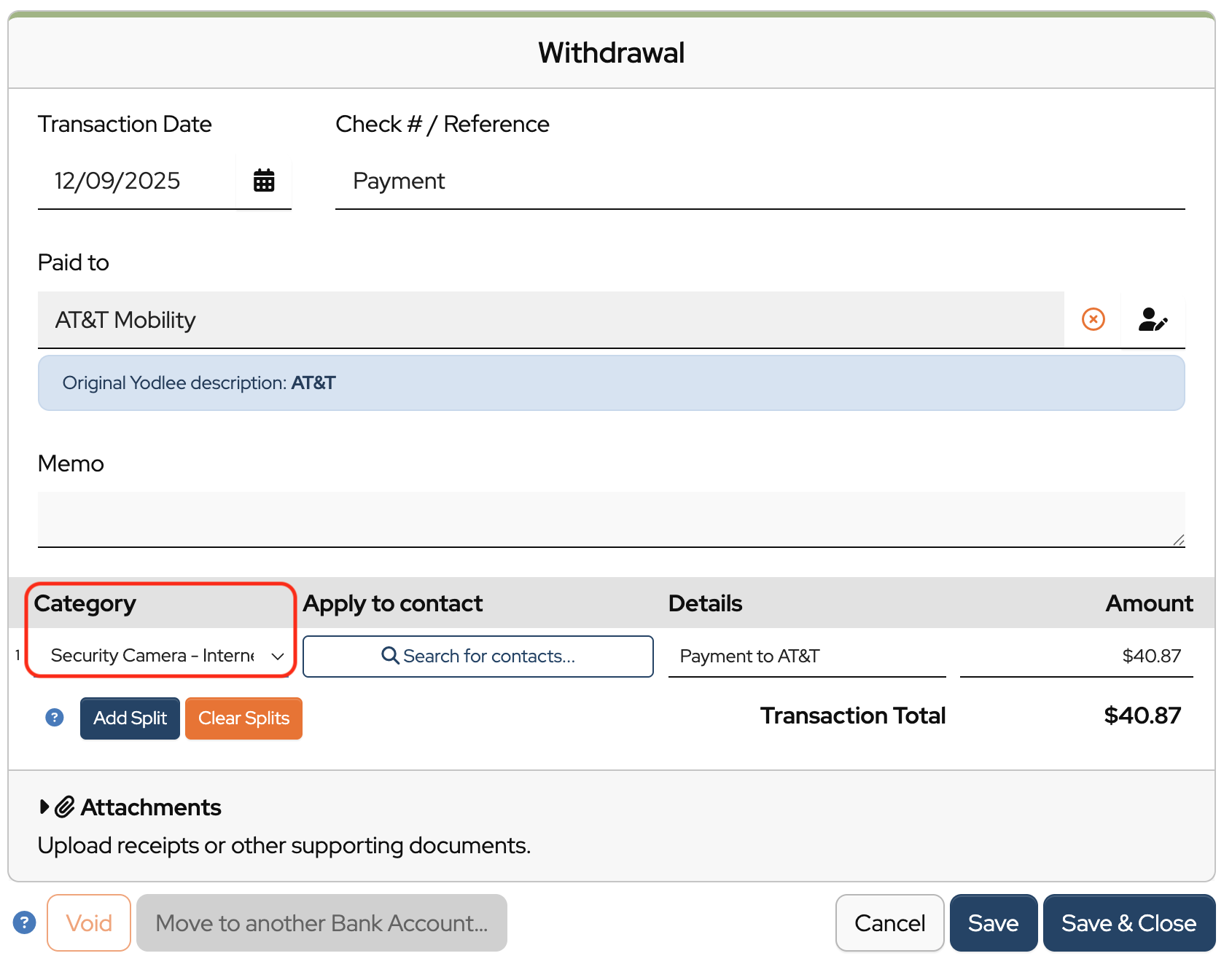 Check that all fields are filled correctly and assign a category from the dropdown. You can also attach a receipt at this point.