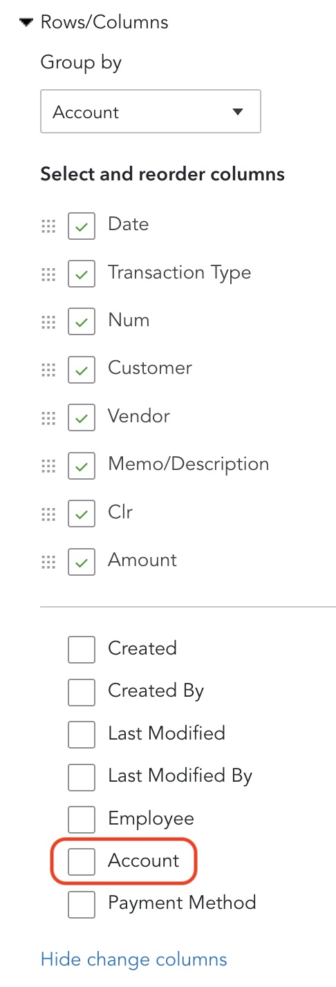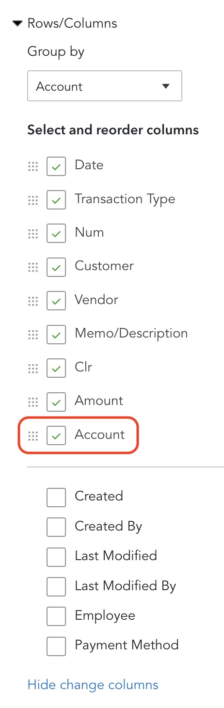 This will bring up the list of columns. Most are checked by default, but you will need to make sure to CHECK Account. (It’s not checked by default)