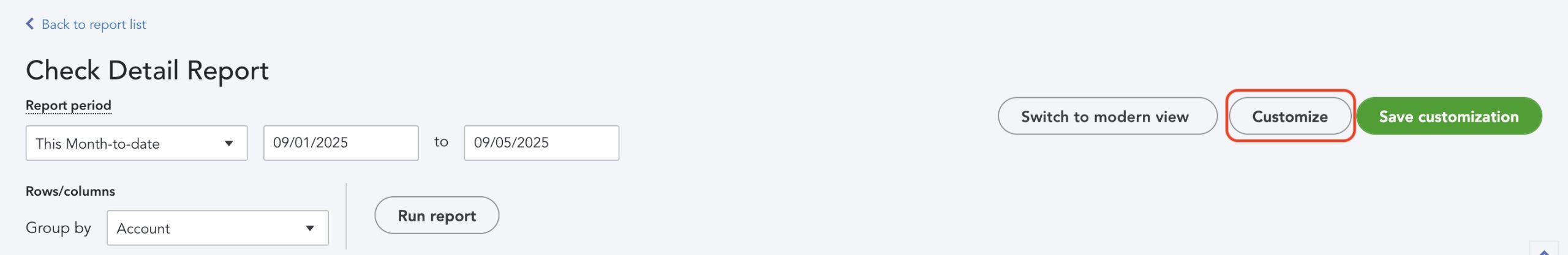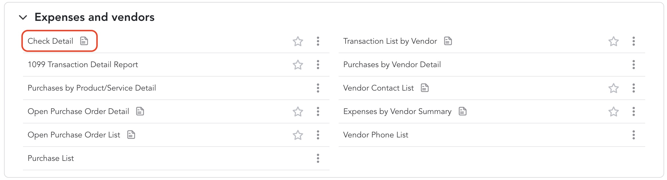 Click Reports, scroll down to Expenses and vendors, and click Check Detail.