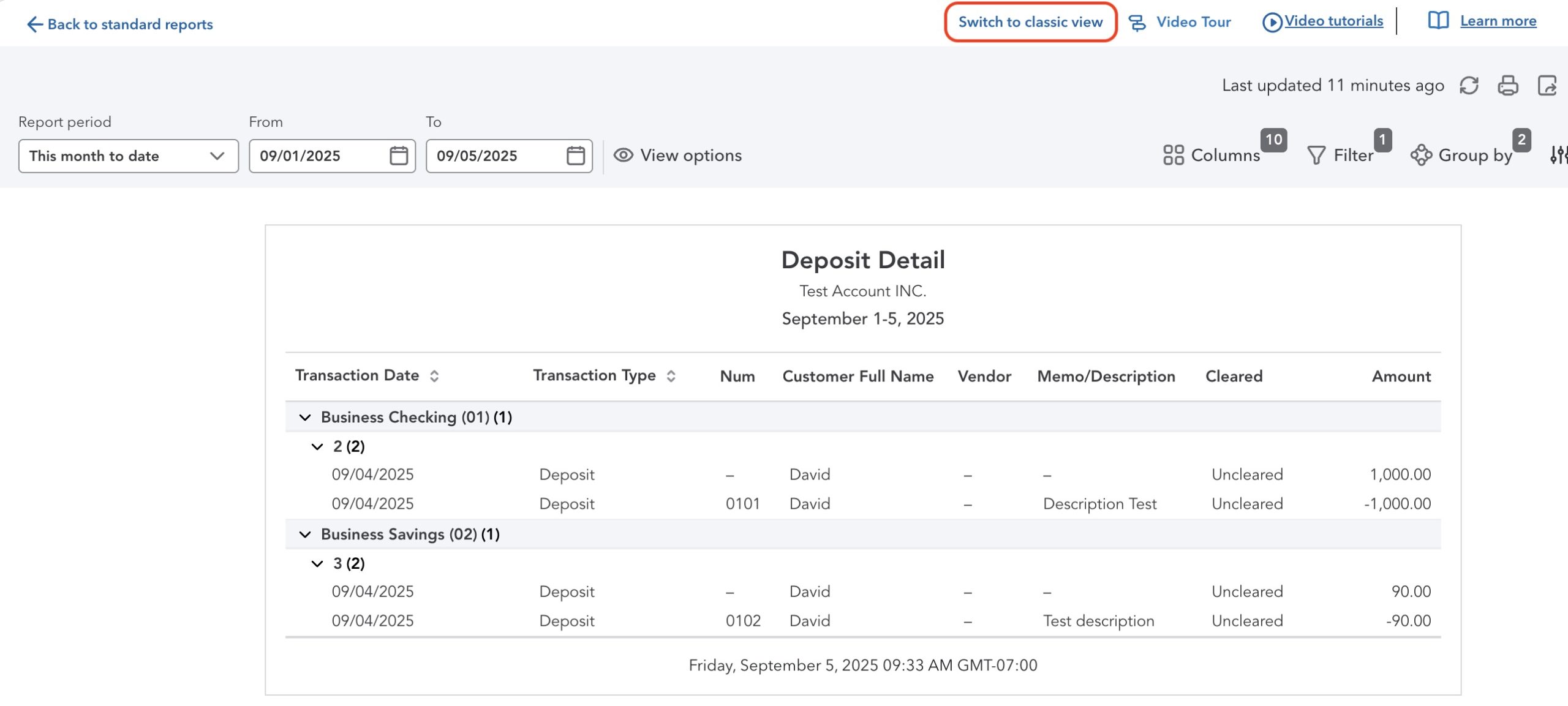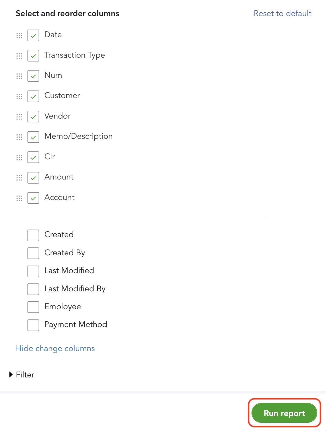 Date, Transaction Type, Num, Customer, Vendor, Memo/Description, Clr, Amount, and Account MUST be checked.