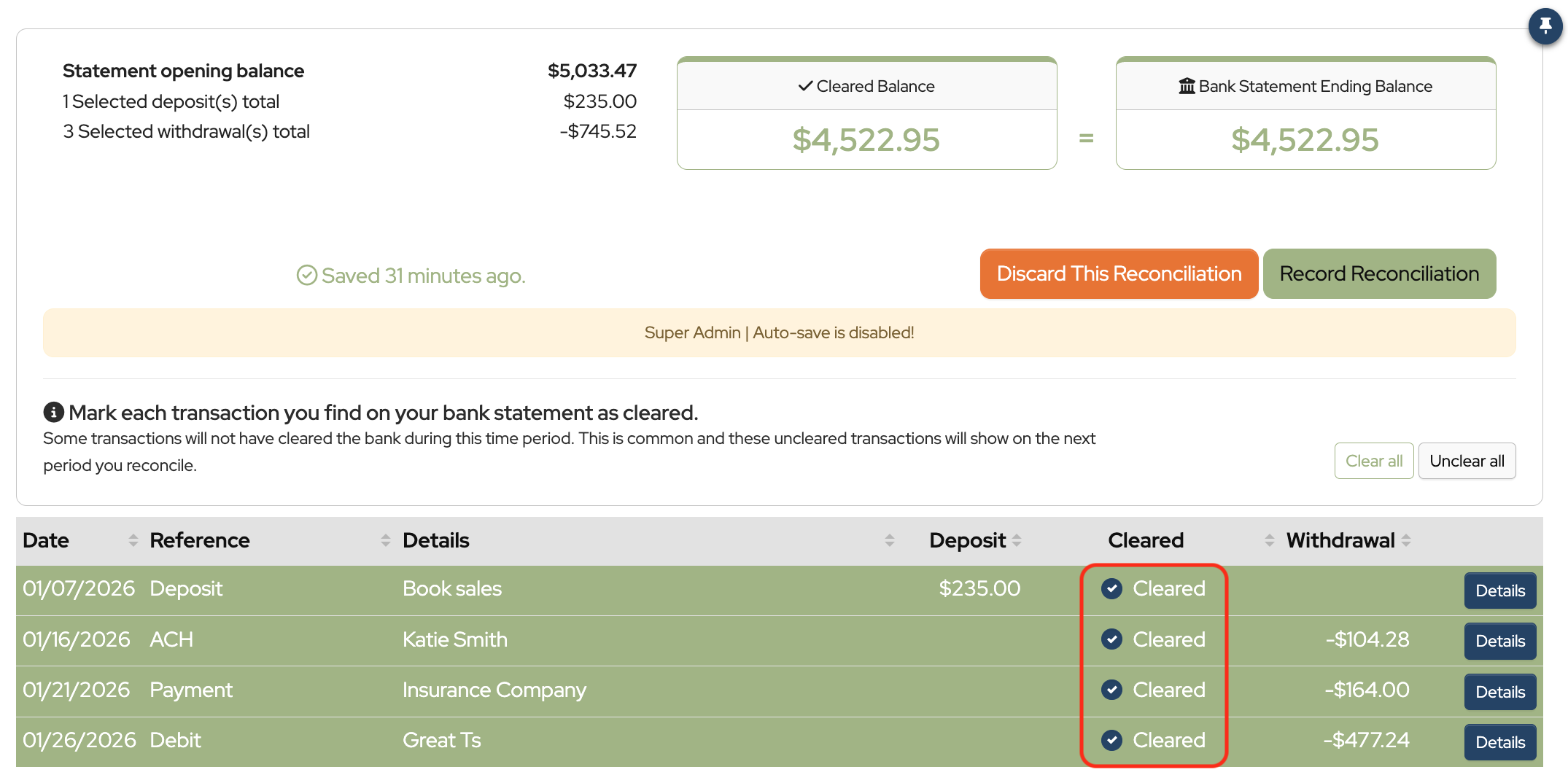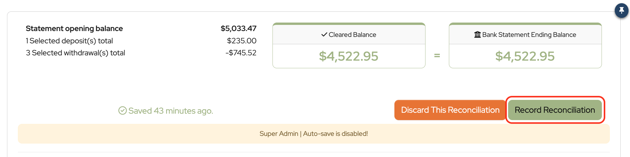 Once all transactions that appear on the bank statement have been checked off, the Record Reconciliation button should become available.