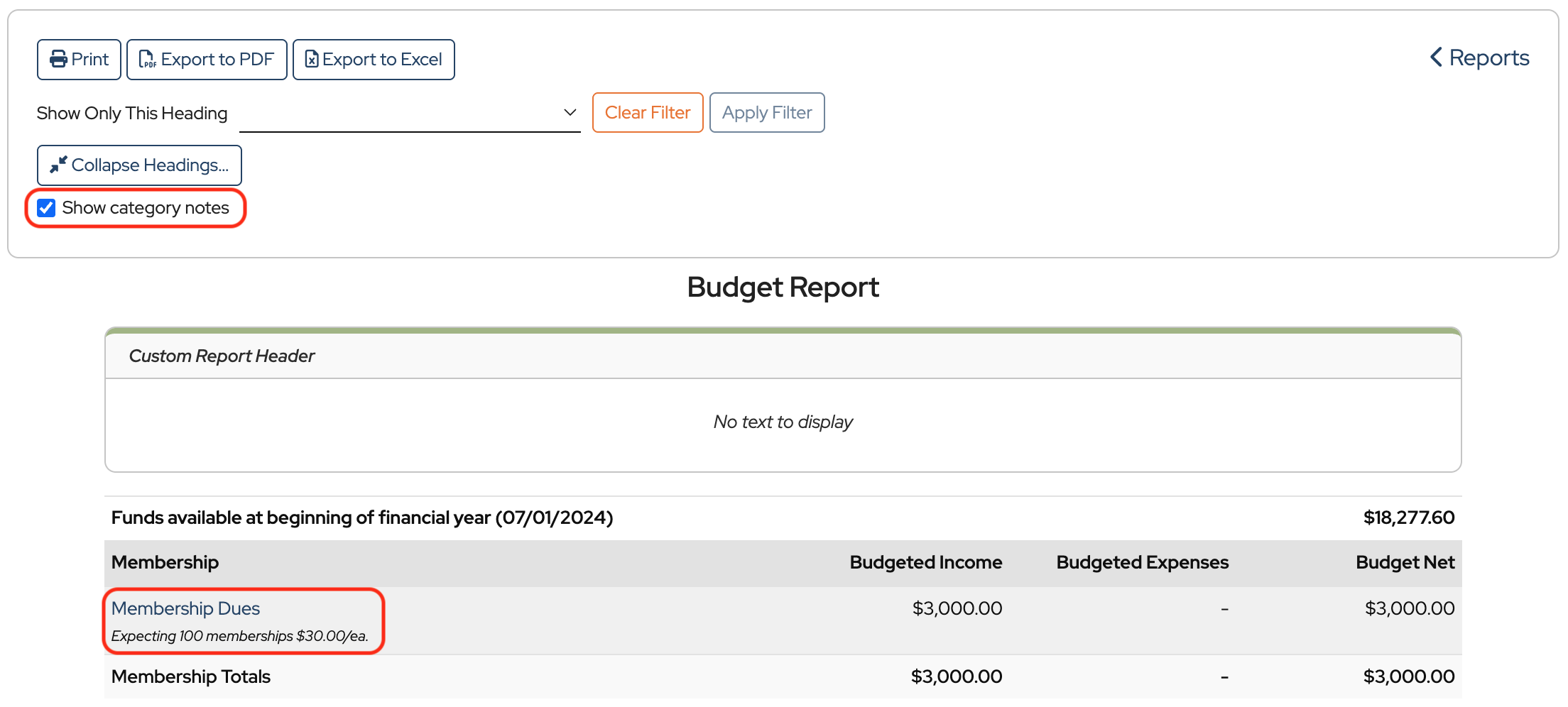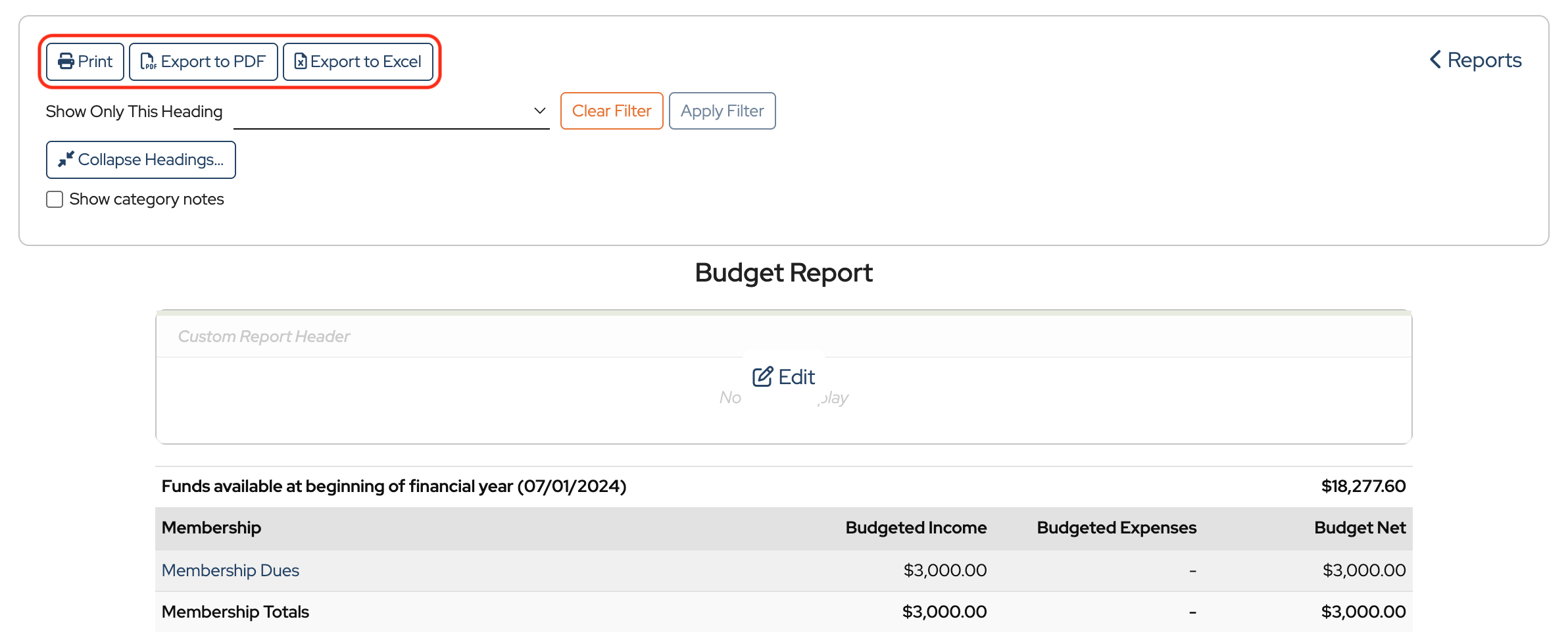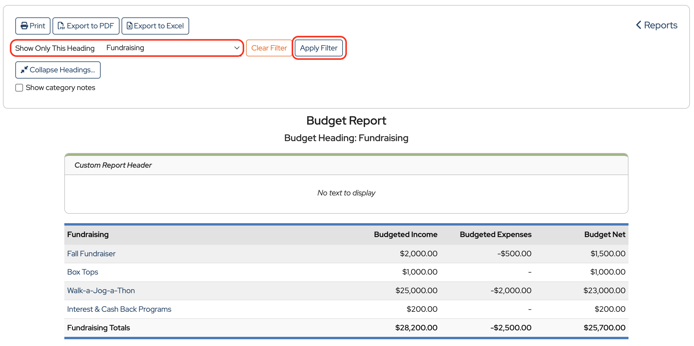 Once the Budget Report is open, there are options to Print, Export to PDF, or Export to Excel.