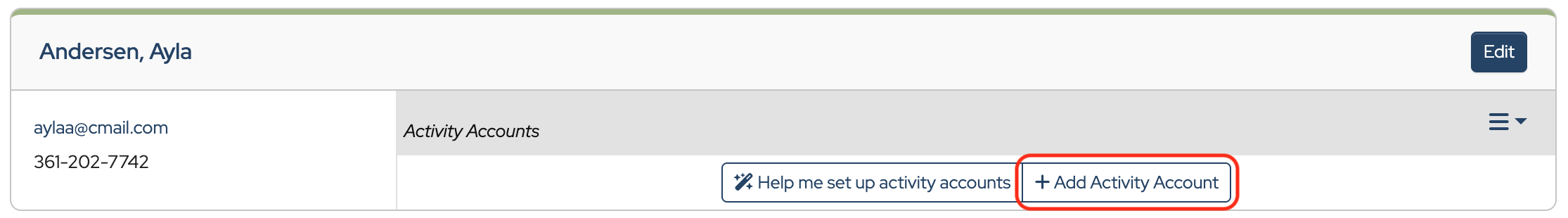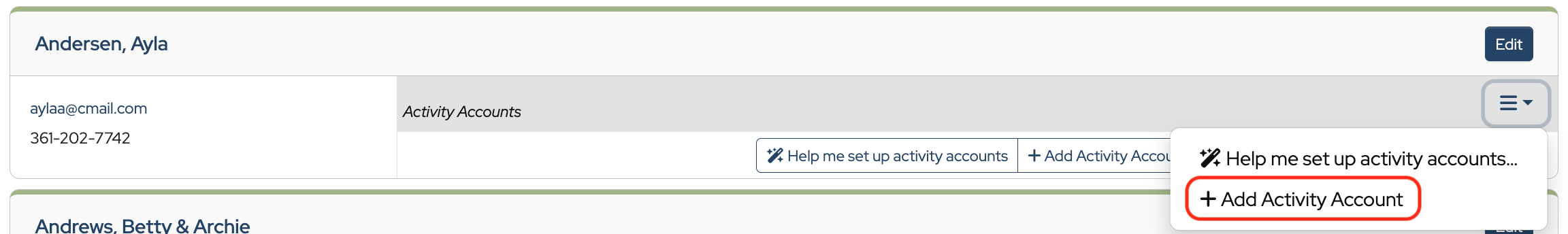 To add additional Activity Accounts to a contact, click the “hamburger” under the Edit button and choose Add Activity Account from the dropdown. Go through the steps above for each Activity Account you’d like to add.
