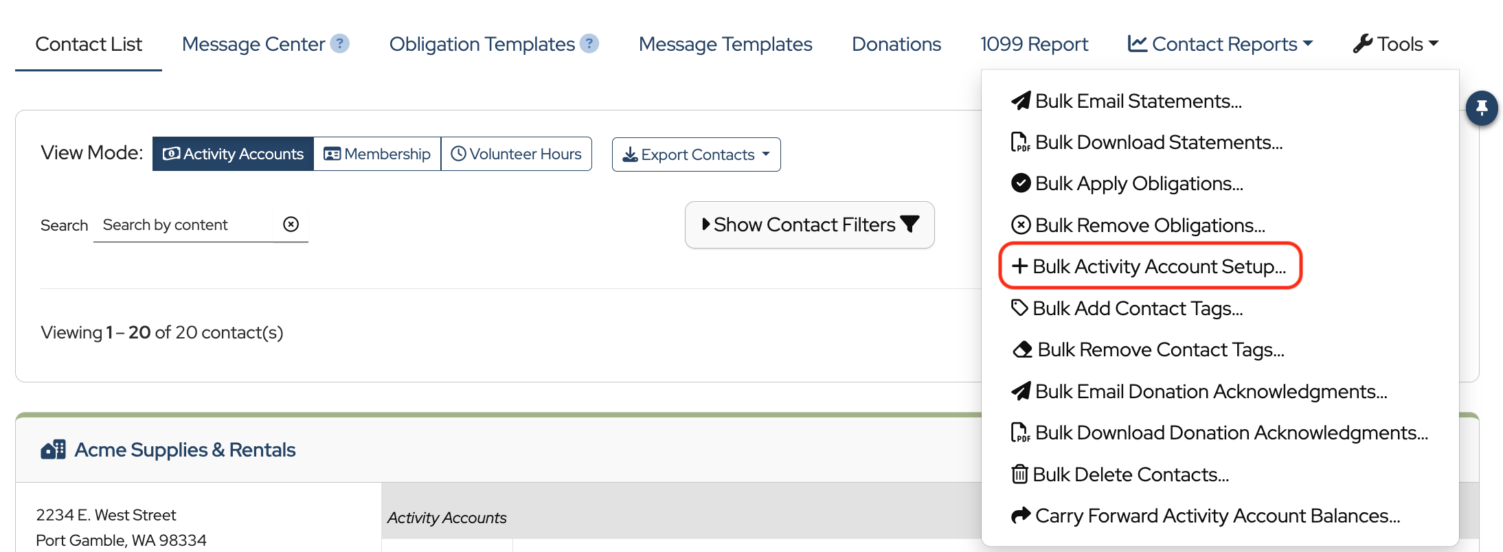 Activity Accounts can be added to multiple contacts at once using the Bulk Activity Account Setup…