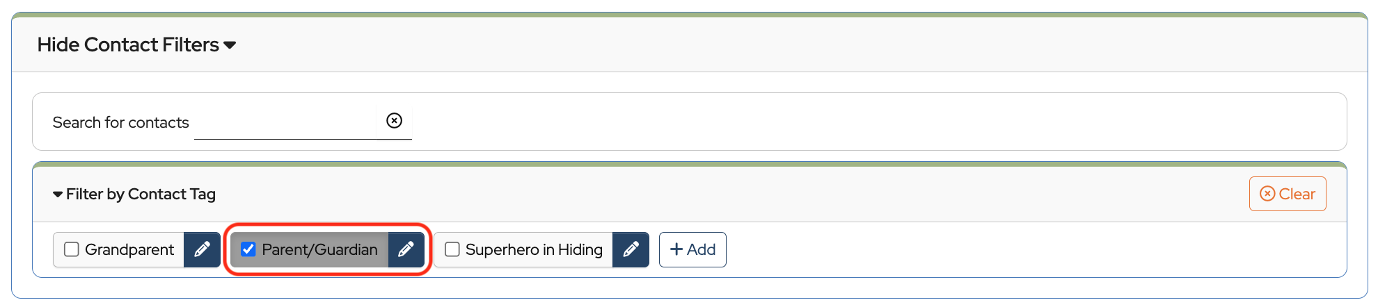 If tags have been added to your contacts, you can filter by tag to set up Activity Accounts for different groups of contacts. Click Show Contact Filters. Under Filter by Contact Tag, click the box next to the tag for the group you want to set up Activity Accounts for.