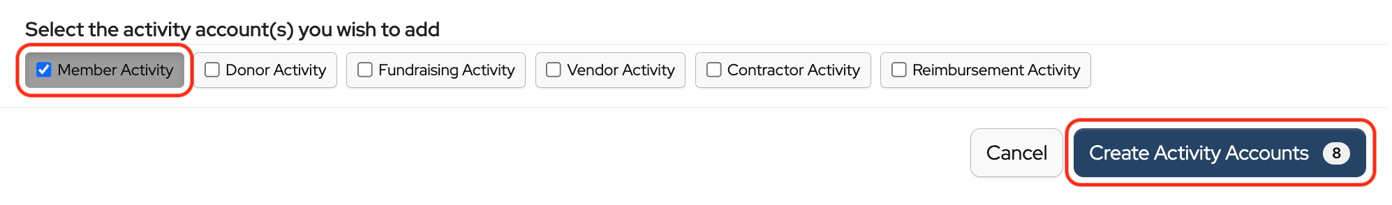 Select the Activity Account(s) you wish to add by clicking the box(es).