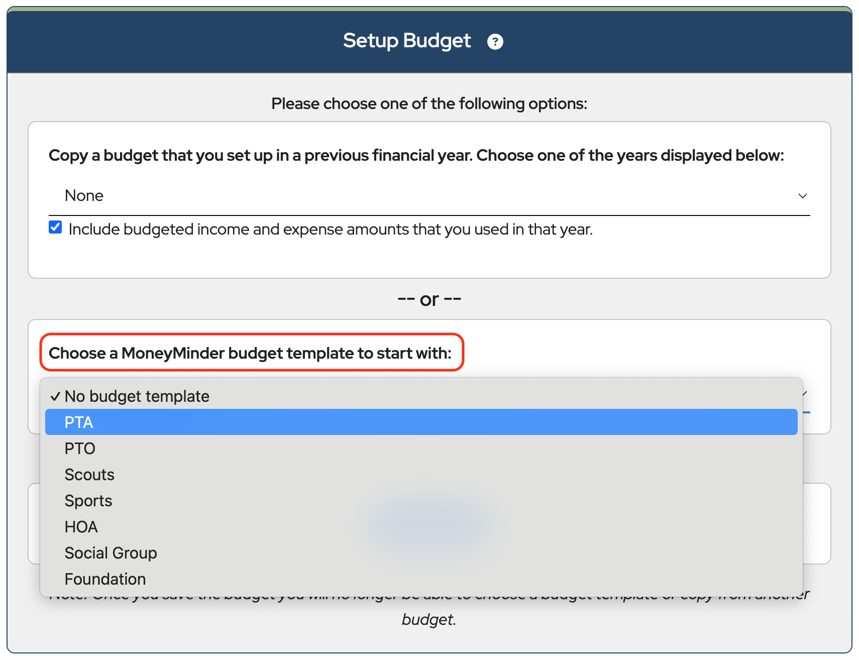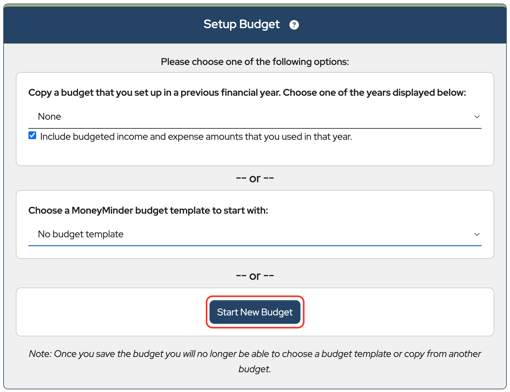 Select a budget template from the dropdown under Choose a MoneyMinder budget template to start with.
