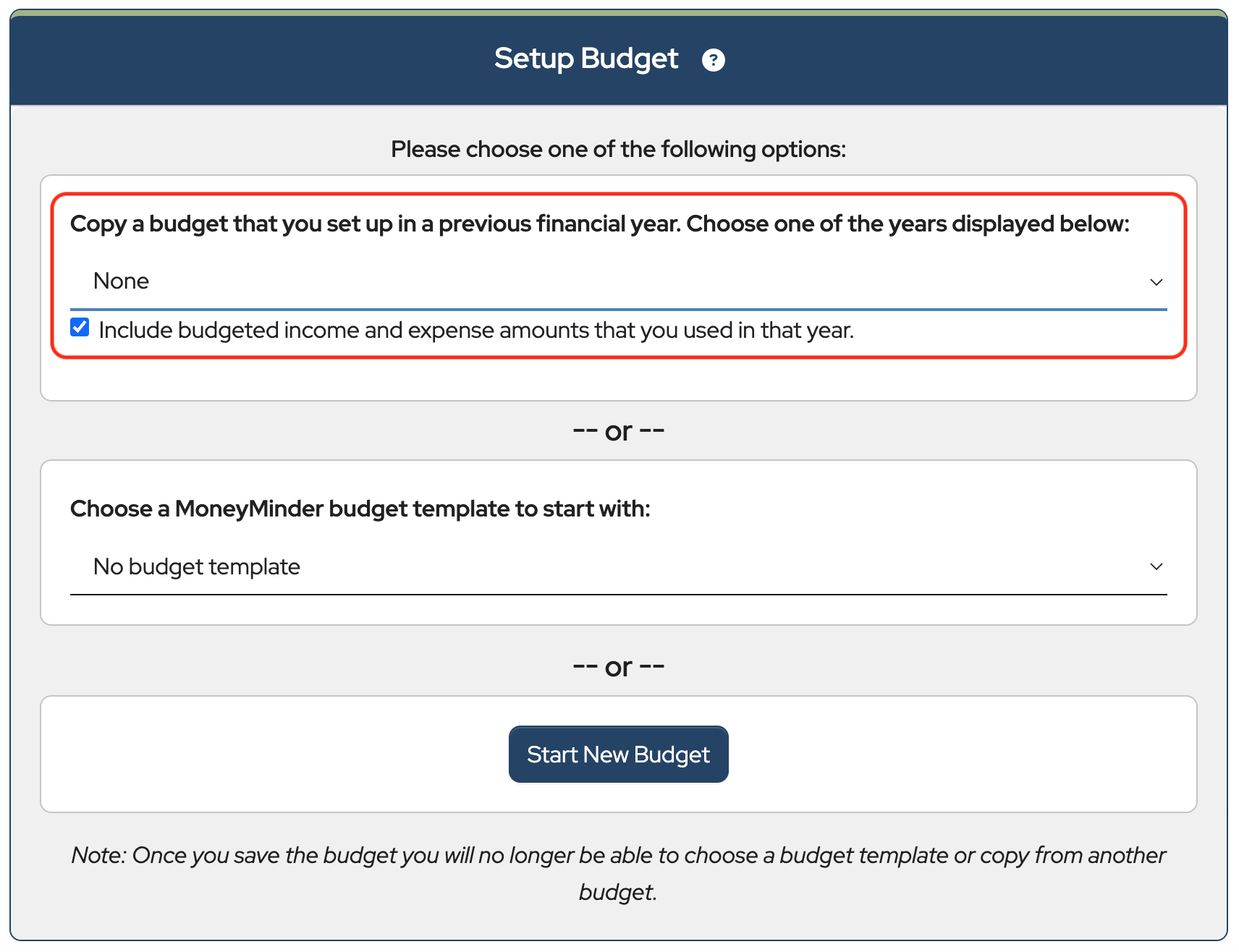 Click the dropdown under Copy a budget that you set up in a previous financial year. Choose one of the years displayed below: Select the year you would like to copy.