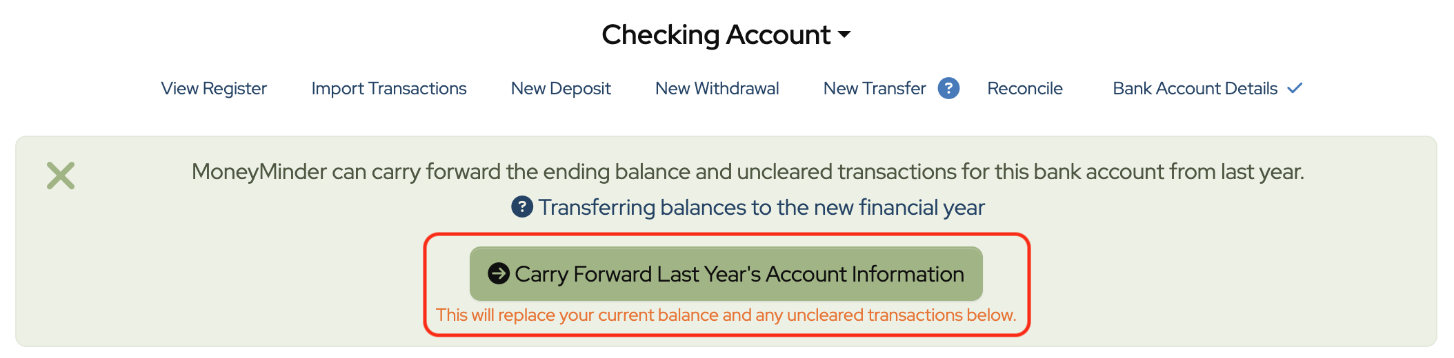 Click Carry Forward Last Year’s Account Information. This will carry forward the bank balance and any uncleared transactions from the prior financial year.