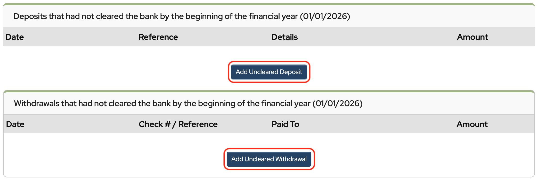 Click Add Uncleared Deposit or Add Uncleared Withdrawal to enter outstanding deposits or withdrawals from the prior financial year that did not clear the bank by the start of the new financial year.