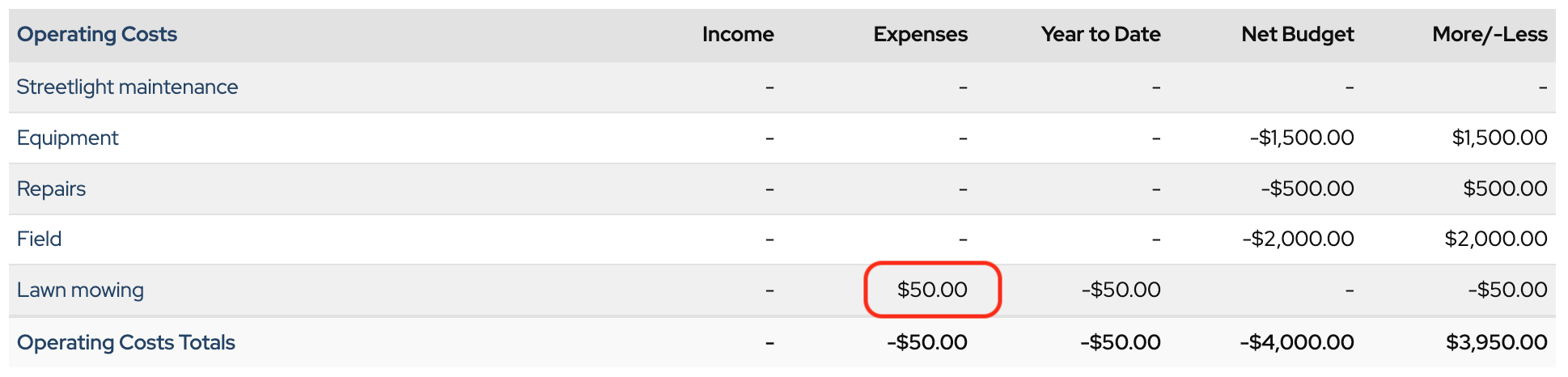 You see that $50.00 in expenses has been recorded in the Lawn mowing category.