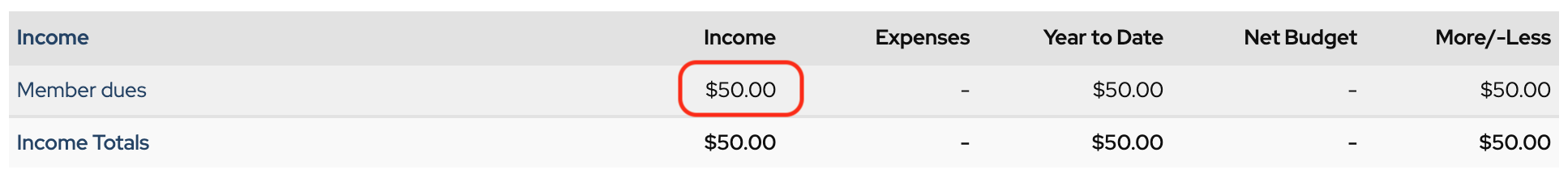 And $50.00 in income has been recorded in the Member dues category.