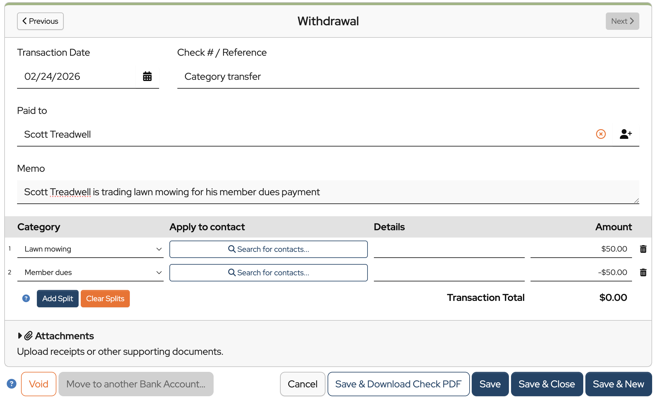 Notice that in this withdrawal, a positive number is entered for lawn mowing and a negative number is entered for Member dues. The net amount of the transaction is $0.00, which is accurate since no “real” money is changing hands.